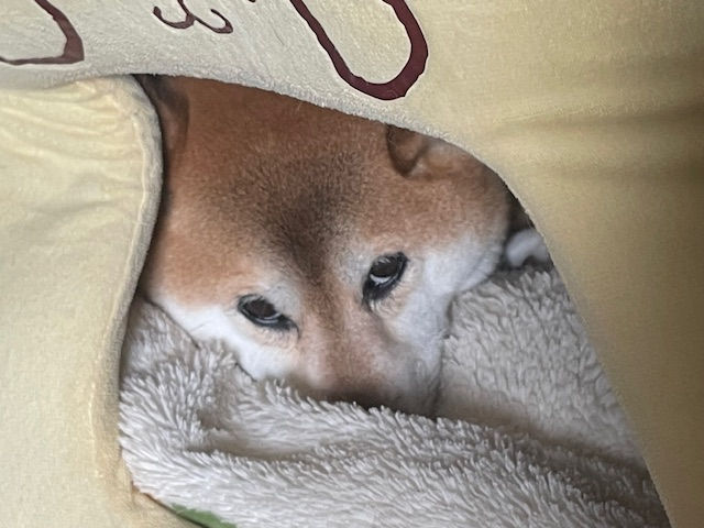 Finishing her meal, Kaji retreats to her kernel - a soft. cave-like dog bed with raised edges. Blankets inside.